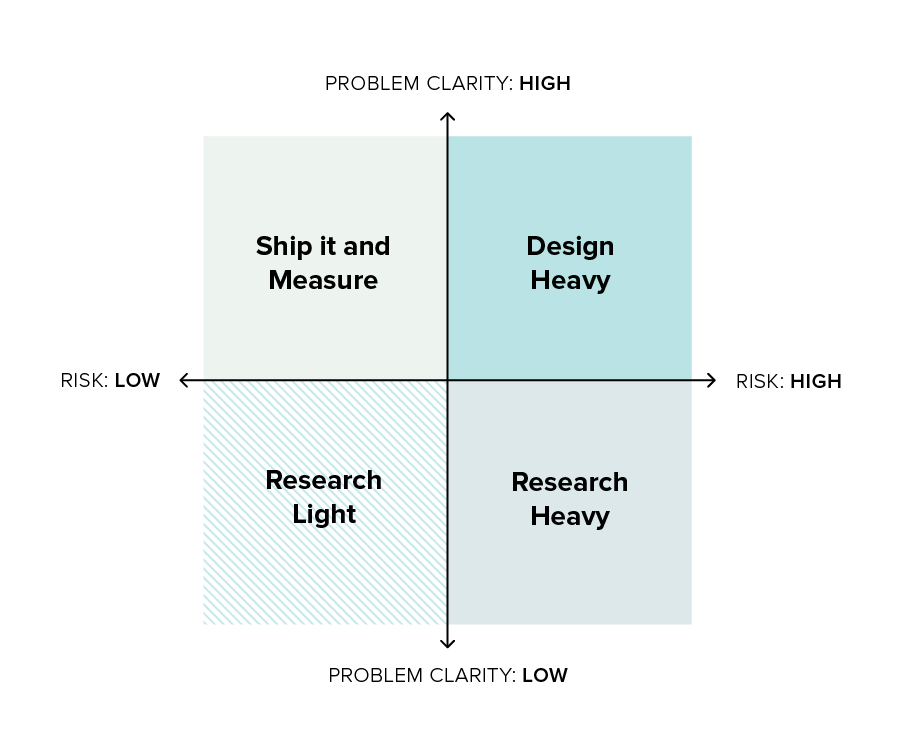 Not all problems are worth solving, and not all solutions are worth building. Before committing resources, I push teams to align on what matters most. A useful tool for that conversation is a simple risk matrix that maps design work against two variables: how well we understand the problem, and how much is at stake if we get it wrong.